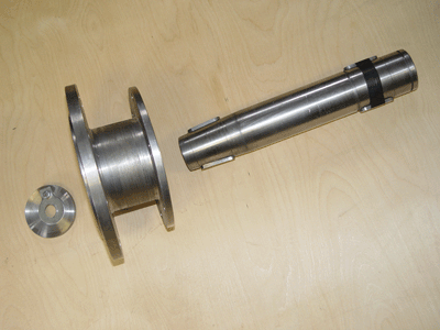 Dieses Bild zeigt die Originalen Zusatzmassen (Radgewichte) in der geteilten Version. Gleichzeitig ist in der Mitte die eingebaute nach gefertigte Achse mit Kegelstumpf eingebaut zu sehen (siehe Bild 2 auf dieser Seite). |